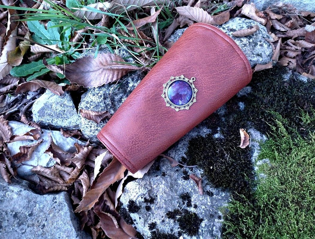 -Pierre d'énergie: Faux cuir effet marbrures marron cuivre, doublure taffetas noire, décoré d'un cabochon en verre reflets roses/violet et son support en métal.