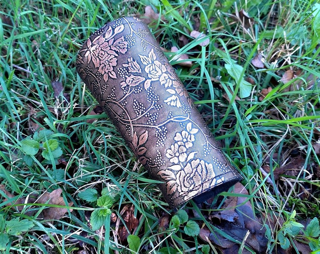 -Roses sépia: Faux cuir bronze, décoré de feuilles et de fleurs marron/cuivre, doublure taffetas noir.