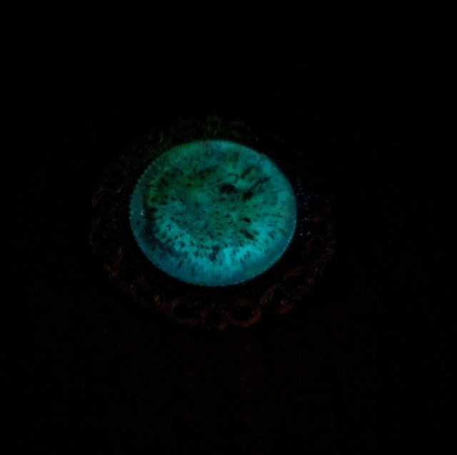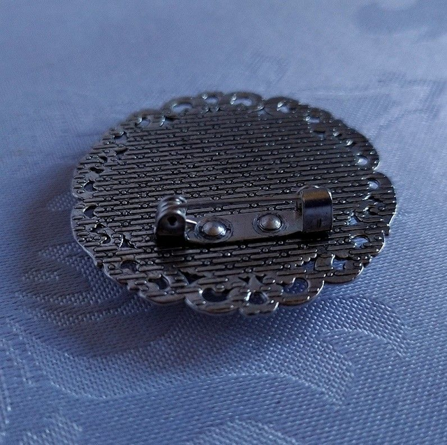 Jolie broche en métal argenté, sertie d'un cabochon brillant dans le noir.