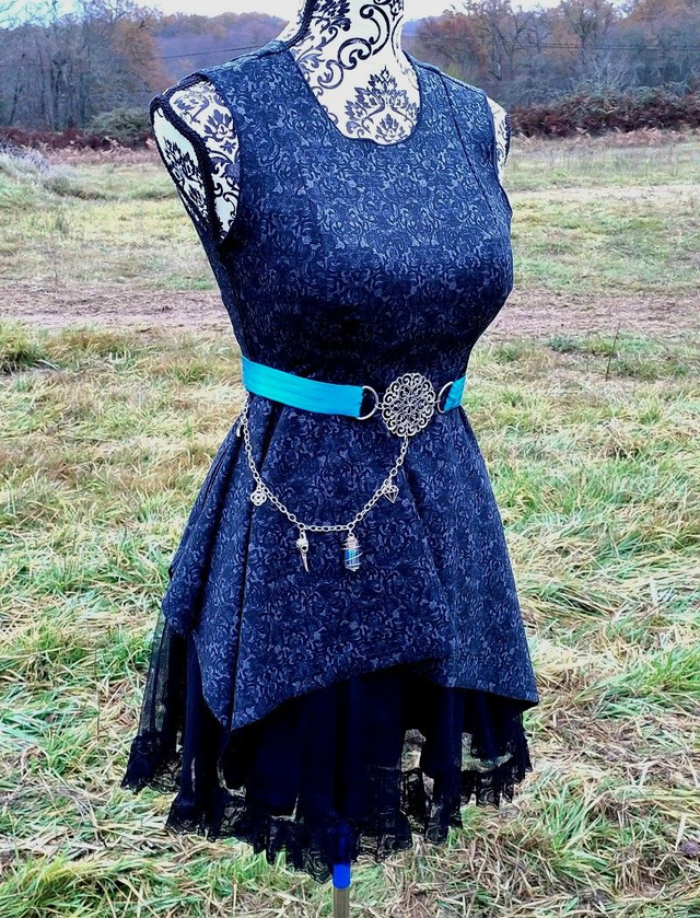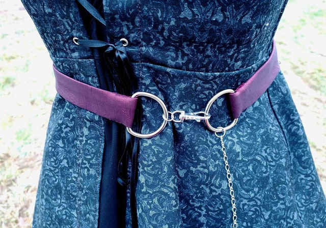 Ceinture largeur 3cm, pendentif large métal (6cm de diamètre), chaine métal, plusieurs breloques. Fermeture mousqueton fin, réglable (une chaine en métal permet de l'ajuster.