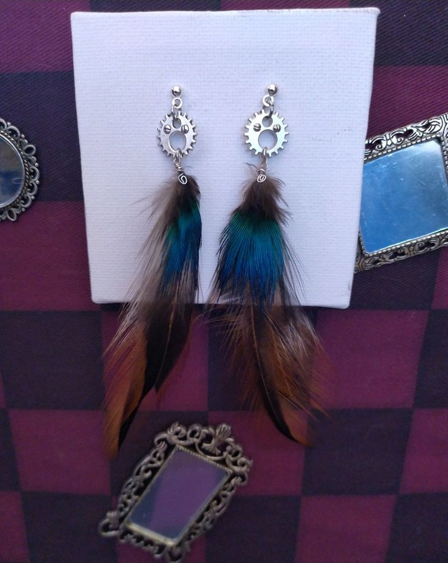 -Duo de plumes: Pendentif rouage à 2 trous en métal argenté, plume de paon bleu & plumes de poules orange, blanche et noire.
