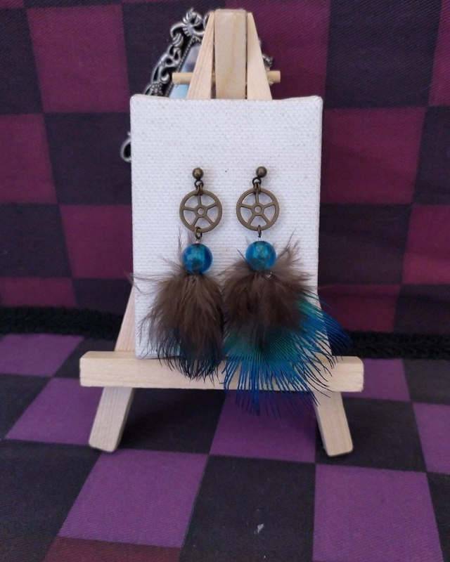 -Plumes douces: Support clous d'oreille en métal bronze, pendentif rouage en métal bronze 5 branches, plume de paon duvet noir et tons bleus/verts, décorée d'une perle en plastique bleue. Dimensions: 2cm x 5.5cm