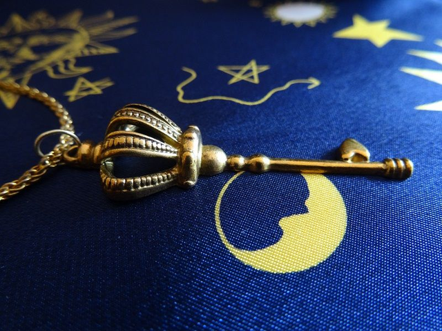Modèle 1: Joli collier support chaine torsadée en métal dorée, breloque clé couronne en métal de même couleur. Le bijou est fermé à l'aide d'un fermoir en forme de "T" doré.