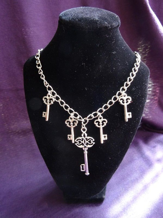 Modèle 2: Joli collier inspiration steampunk, chaine argentée, pendentifs clées. La chaine est en laiton argenté, le fermoir est en laiton doré.