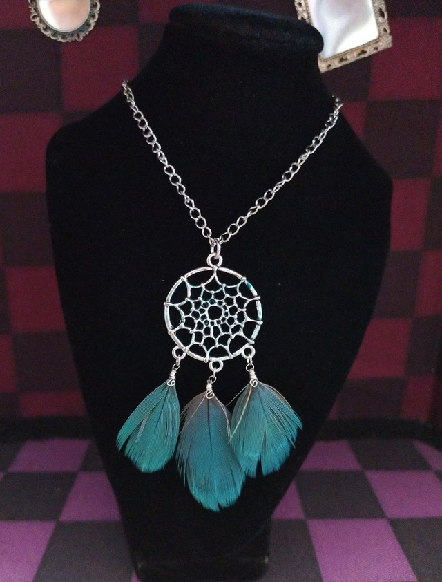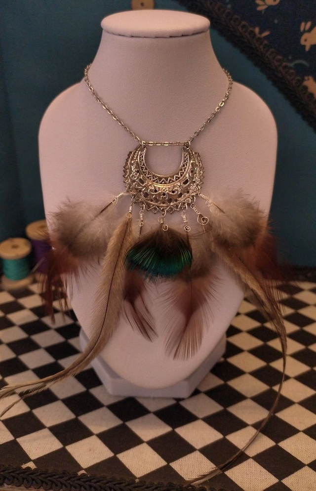 Longueur collier + chaine réglage: 41cm + 11cm Pendentif: 3.5 x 5.5cm Plumes: entre 2cm et 13cm de long.