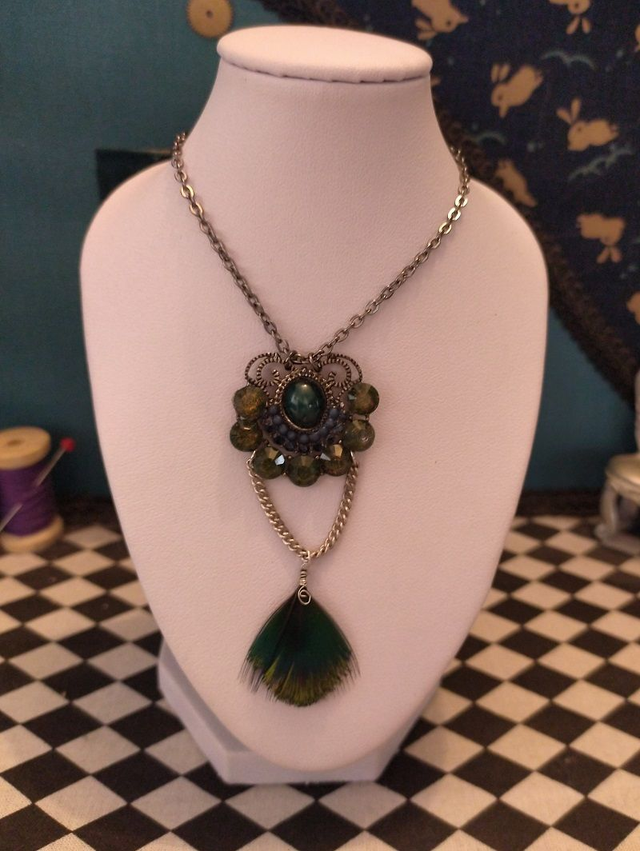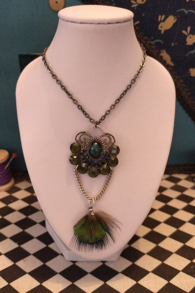 Féerie bleu/vert: Chaine métal, pendentif argent vieillit & strass, plume de paon.