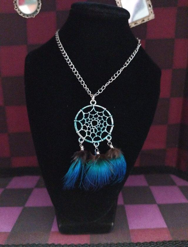 Attrape rêve diurne: Chaine métal, pendentif attrape rêve, 3 plumes de perroquet.
