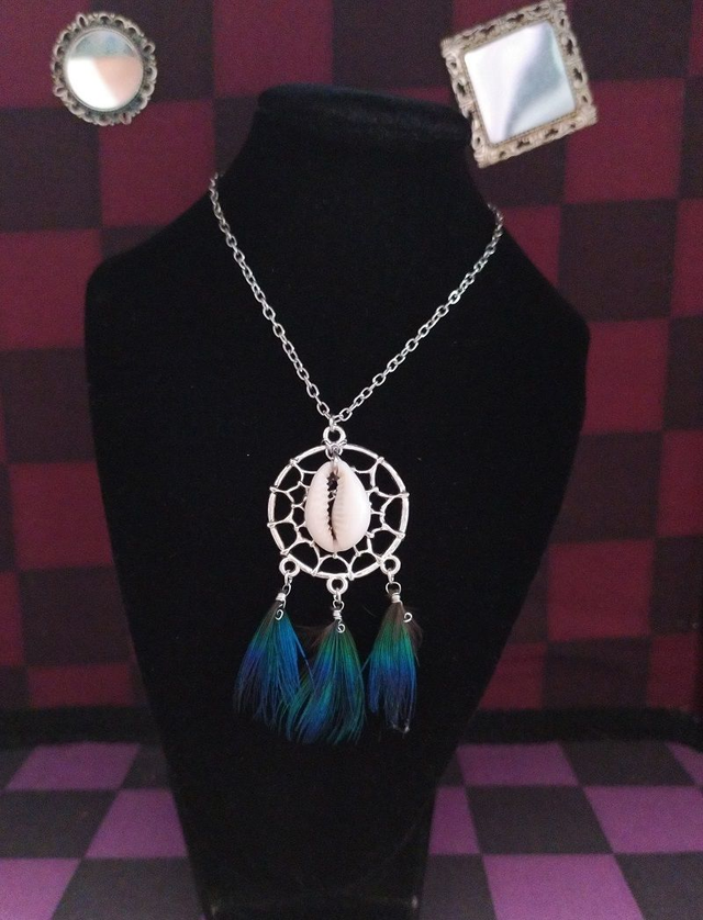 Attrape rêve marin: Chaine métal, pendentif attrape rêve, coquillage blanc, 3 plumes de paon.