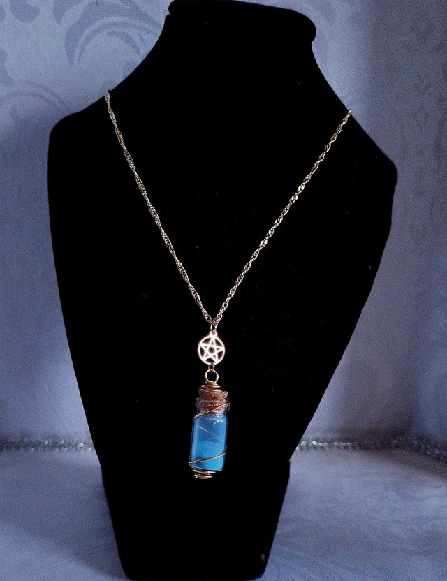 -Elixir de nuit: Fiole et cage à perle, rempli de sable bleu, breloque pentacle doré