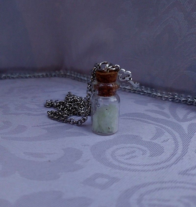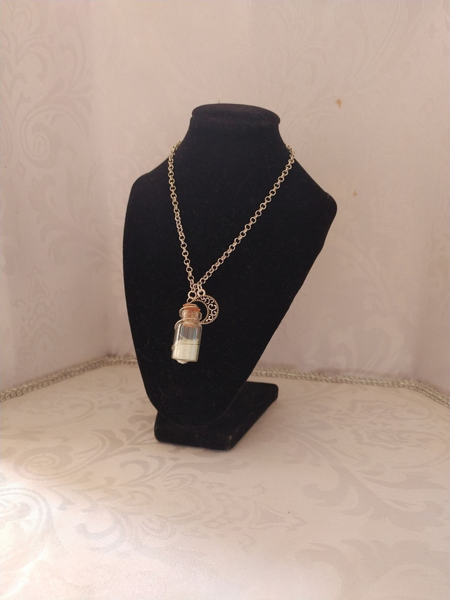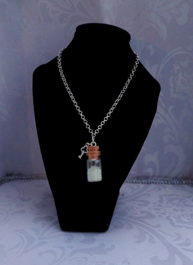 Collier support chaine en métal argenté, pendentif fiole en verre remplie de petits cristaux brillant dans le noir (voir dernière photo). La fiole est décorée d'une breloque en métal argenté. Plusieurs modèles disponibles