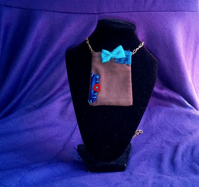 -Alice: Collier poche en coton marron, décorée de coupons de tissu bleu et violet, d'un bouton rouge et d'un noeud turquoise. Le support du bijou est une chaîne en métal bronze. Le bijou est réglable.