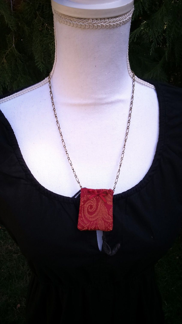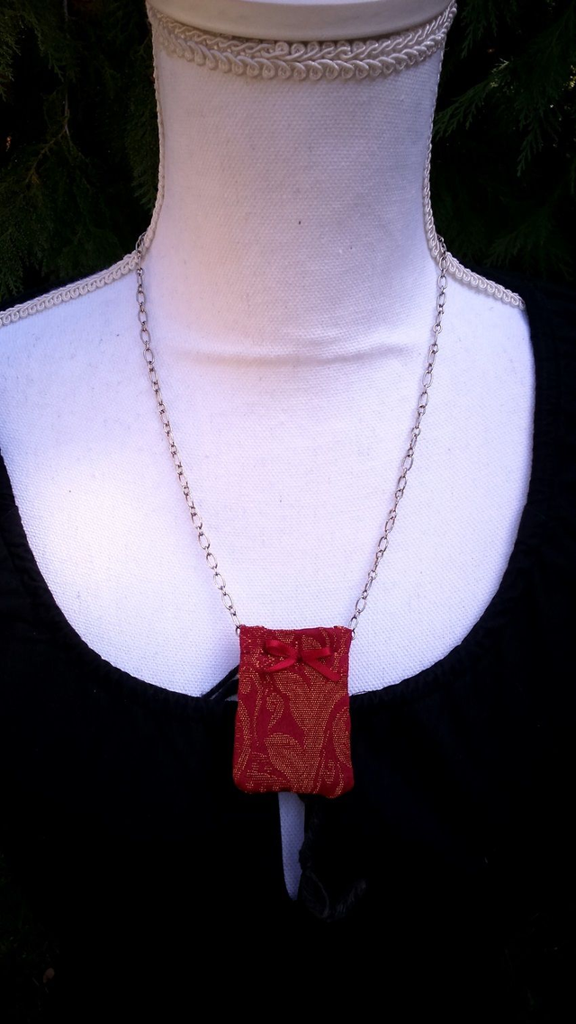 -Victorien: Tissu d'ameublement rouge à motifs dorés, décorée de coupons d'un noeud en satin rouge foncé. Le support du bijou est une chaîne en métal. Le bijou est réglable. Version Chaîne argentée / Chaîne bronze à maillons ronds et ovales / Chaîne bronze à maillons ronds