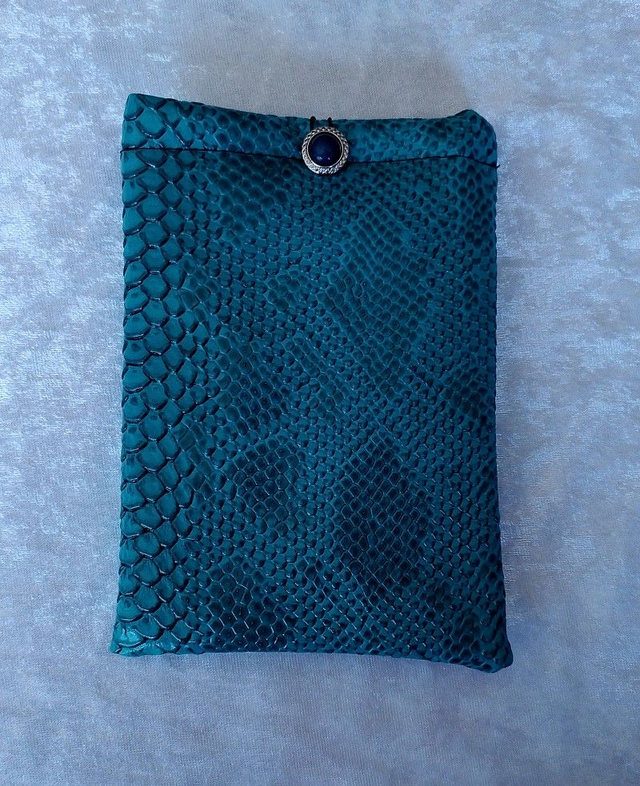 -Simili cuir dragon turquoise, doublure taffetas bleu turquoise, bouton rond argenté et bleu.