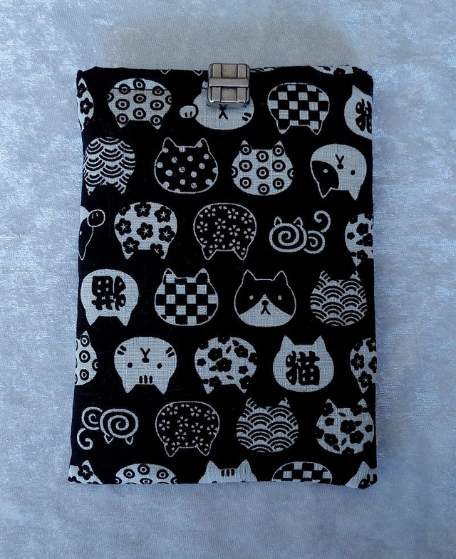 -Coton japonais à motifs de têtes de chats blanches sur fond noir, doublure coton noir, bouton carré argenté.