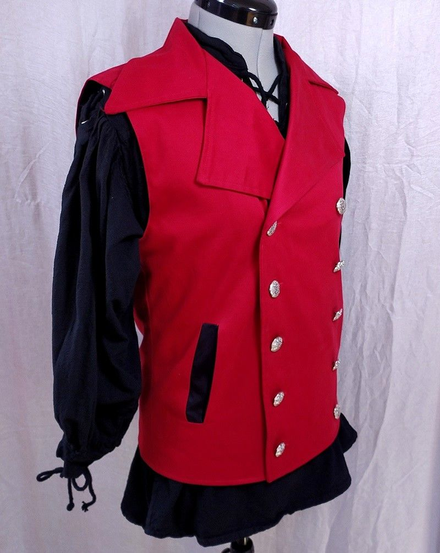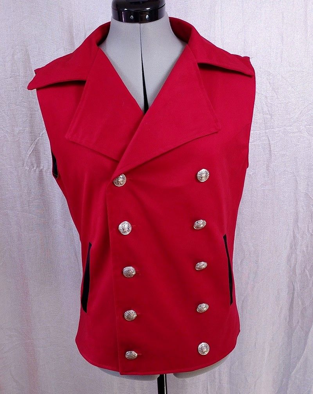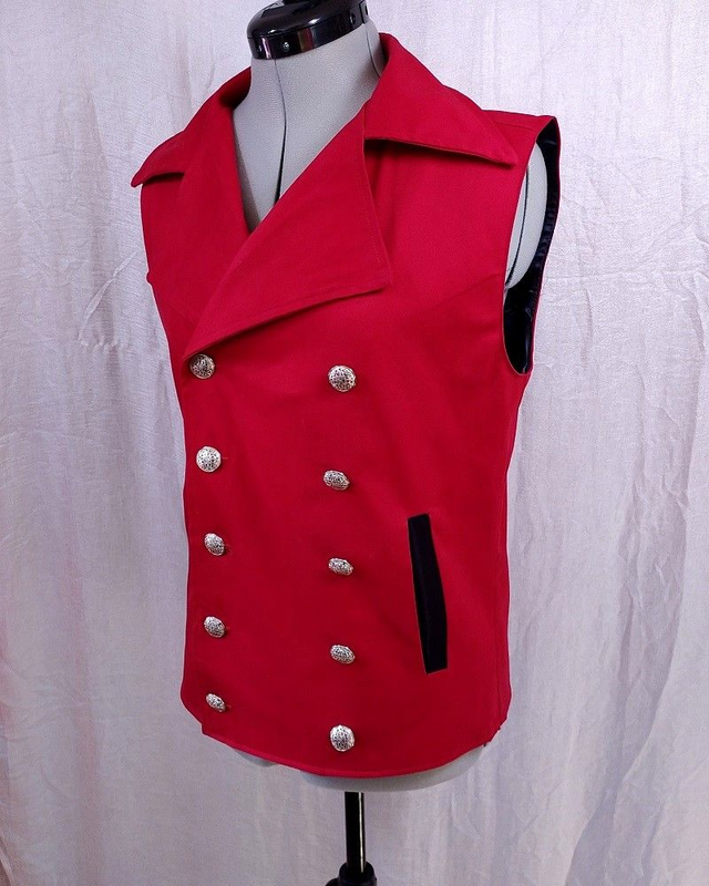 Gilet masculin en coton rouge "doux", doublure satin noir uni. L'habit comporte deux poches sur le devant, et une poche coté gauche niveau poitrine (coté doublure). Le vêtement se ferme par une rangée de bouton et d'un bouton pression caché, la 2nde rangée est décorative.