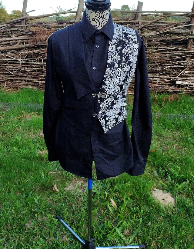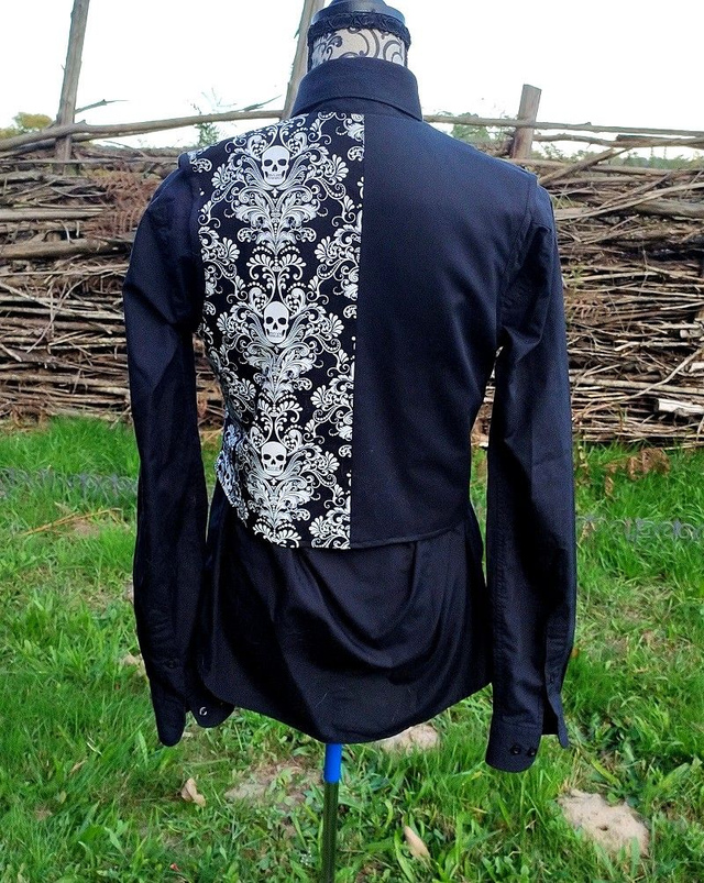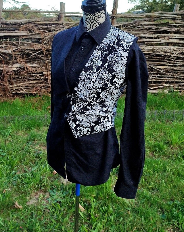 Gilet coton homme bicolore, coté gauche coton fin noir à motifs de crânes et victoriens phosphorescents (brille dans le noir), coté gauche base coton fin noir, doublure en satin noir. L'habit comporte des poches sur le devant et se ferme à l'aide de brandebourg en métal argenté foncé. Taille M