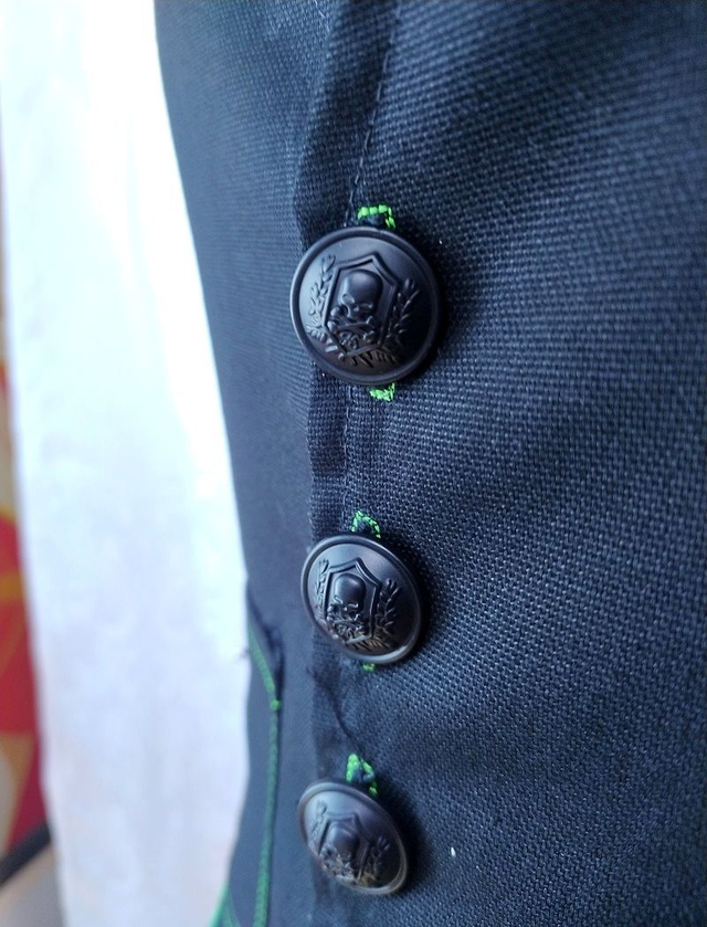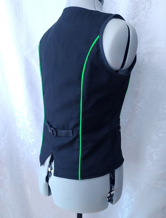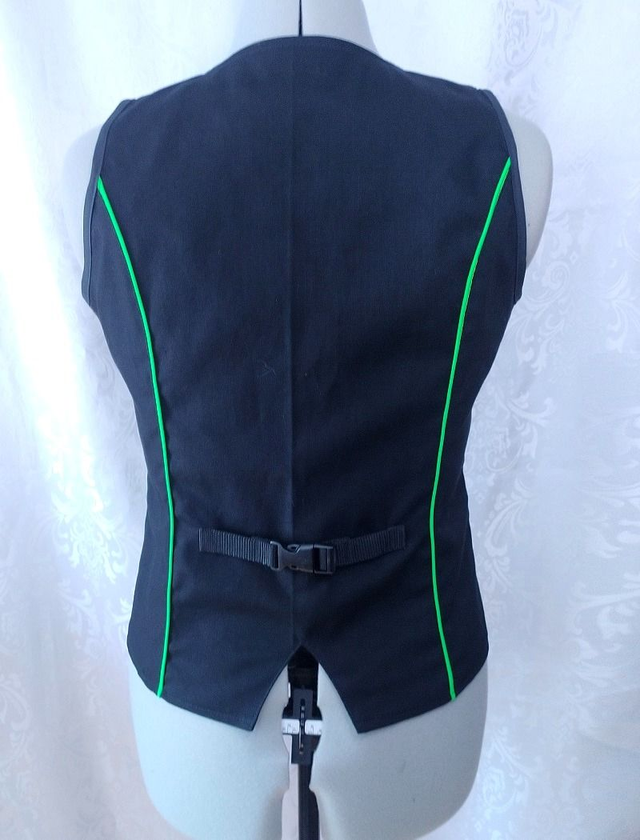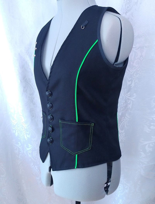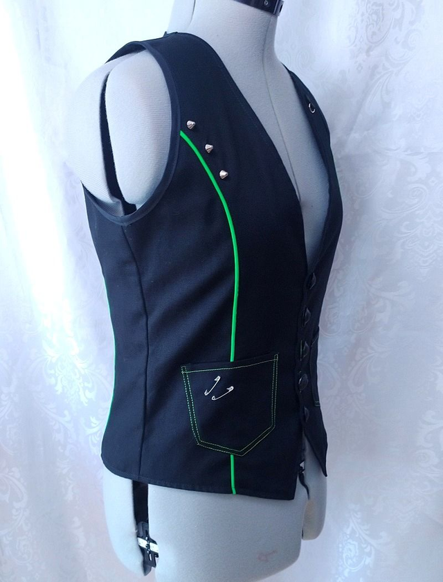 Gilet unisex style cyberpunk, décoré d'un passepoil vert fluo réagissant à la lumière noire sur le devant et le dos. Le devant est agrémenté de rivets en métal, d'une boucle demi-lune, de deux poches plaquées (avec du fil réagissant à la lumière noire) & d'épingles à nourrice. Le dos est décoré d'une bande décorative avec une boucle clip en plastique noire. Le vêtement n'est ni réglable ni extensible.