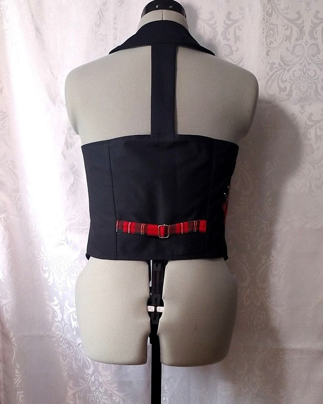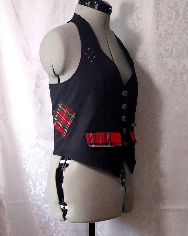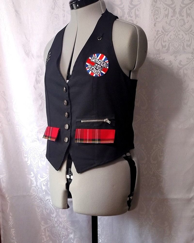 Gilet femme style Punk/rock en coton noir, décoré de coupons de tartan, d'épingles à nourrice, d'un patch "Punks not dead", d'une fermeture à glissière, de deux poches fonctionnelles. Le gilet se ferme à l'aide de boutons fantaisie en métal. Le vêtement n'est ni réglable ni extensible.
