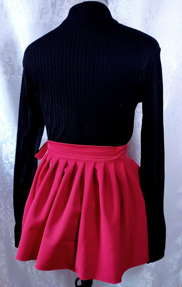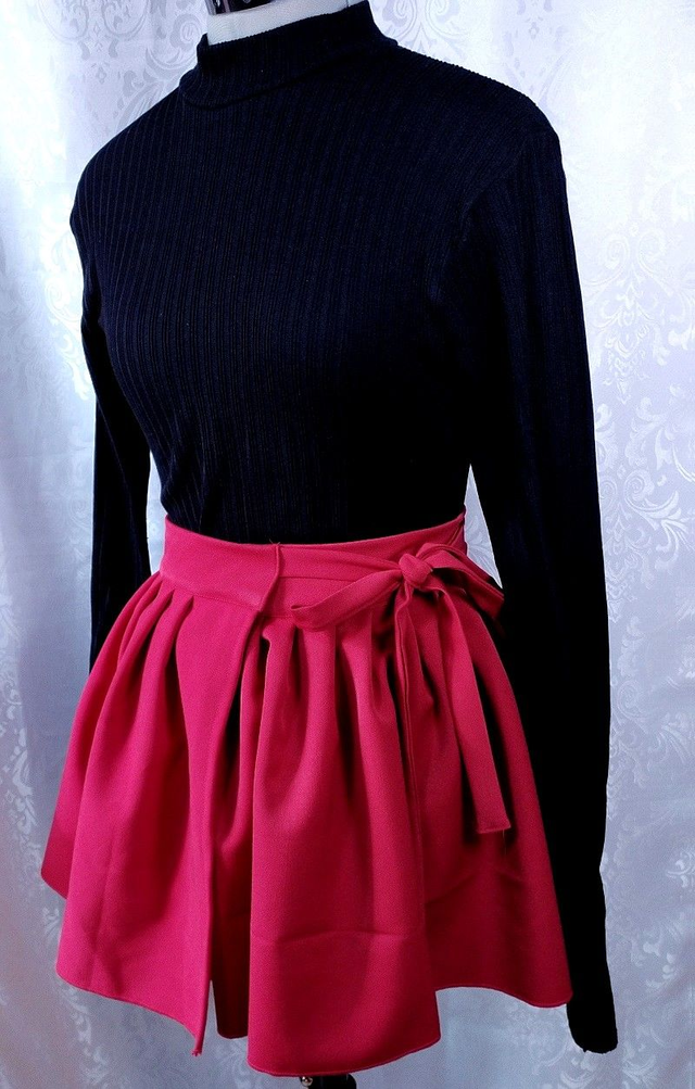 Jolie jupe courte en gabardine de coton rouge à plis plats. La jupe se noue à l'aide de deux liens et d'une fente au niveau de la ceinture (permettant le passage d'un des liens). Le vêtement est ajustable.