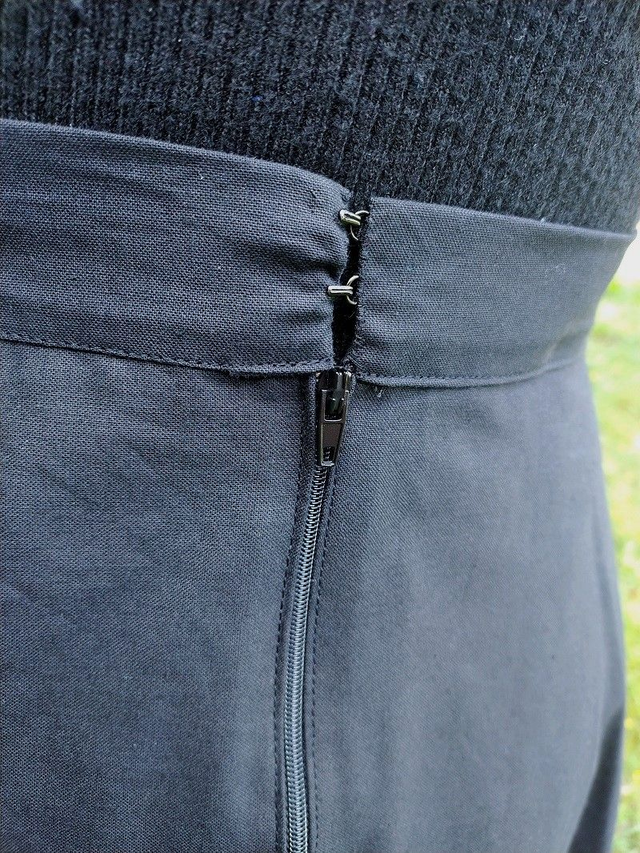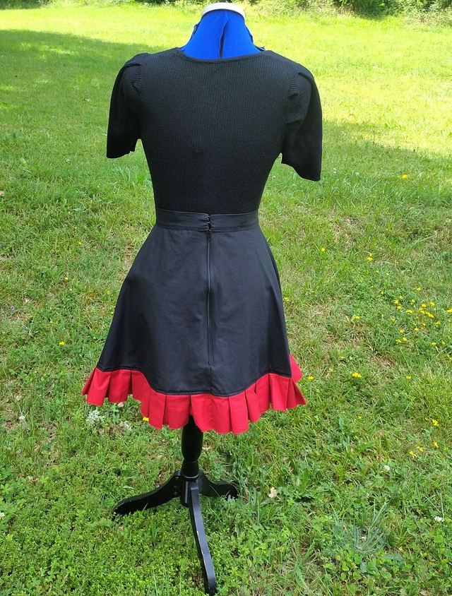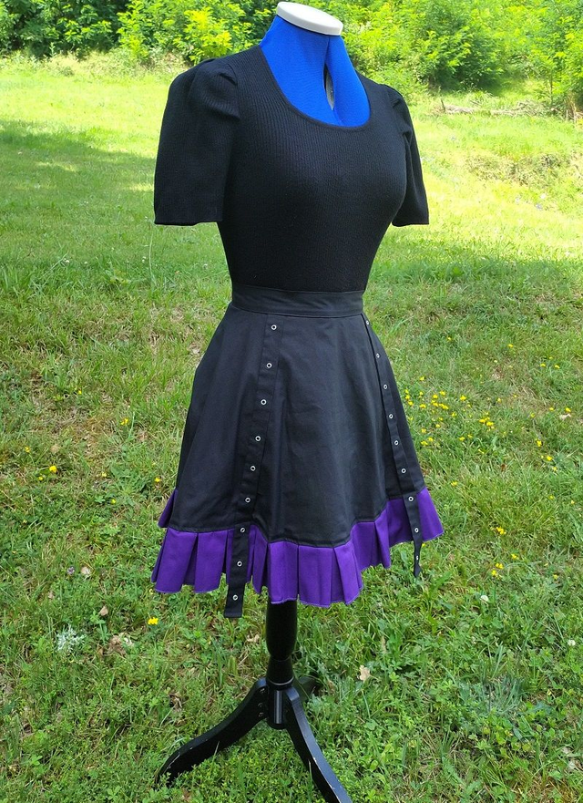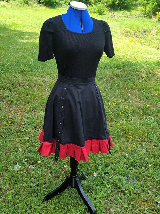 Jupe gothique en coton. Le vêtement est cintré à la taille (et extensible) et évasé vers le bas. La jupe est décorée d'une rangée de plis et de deux bandes à œillets en métal. Le vêtement se ferme à l'aide de crochets en métal et d'une fermeture à glissière.