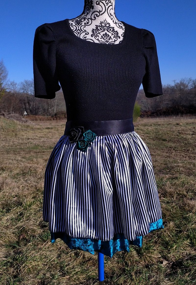 Turquoise: Base satin léger à rayures noires et blanches, panne de velours turquoise. Ceinture satin noire décorée d'une grande rose noire et deux petites roses turquoises. Tour de ceinture: 77 à 87cm / Longueur jupe: 42cm / Longueur fermeture:18cm