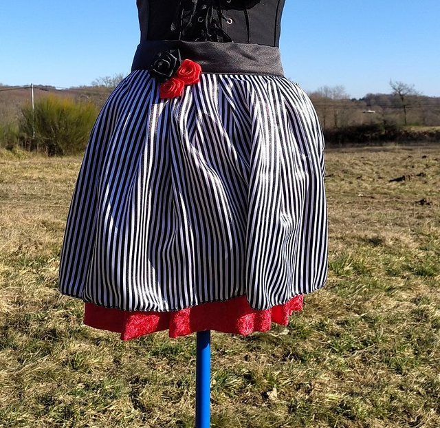 Rouge: Base satin léger à rayures noires et blanches, panne de velours rouge. Ceinture satin noire décorée d'une grande rose noire et deux petites roses rouges. Tour de ceinture: 72 à 78cm / Longueur jupe: 42cm / Longueur fermeture:18cm