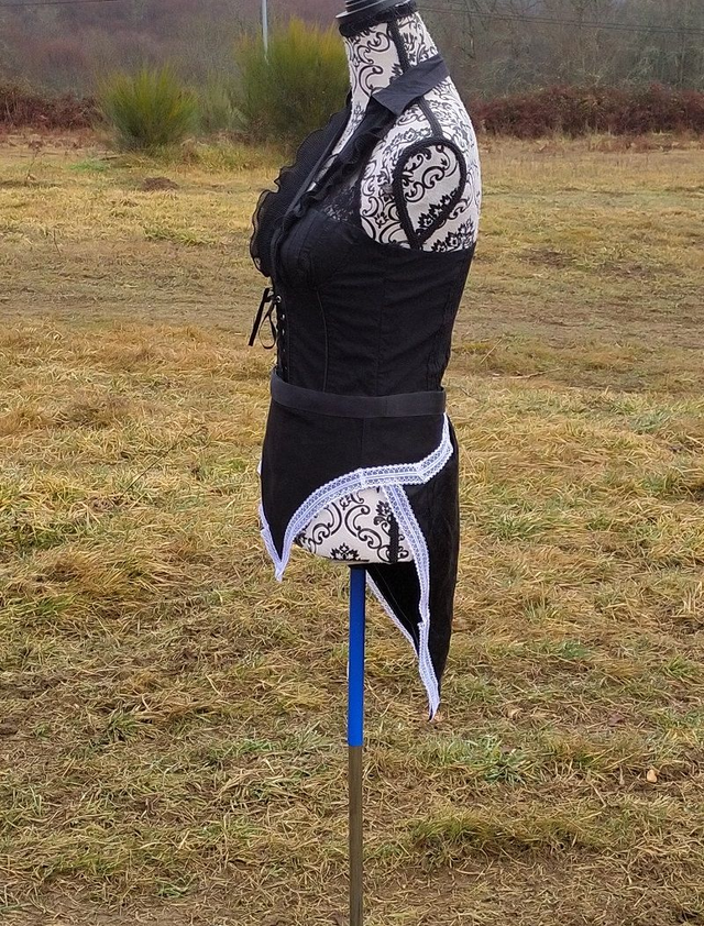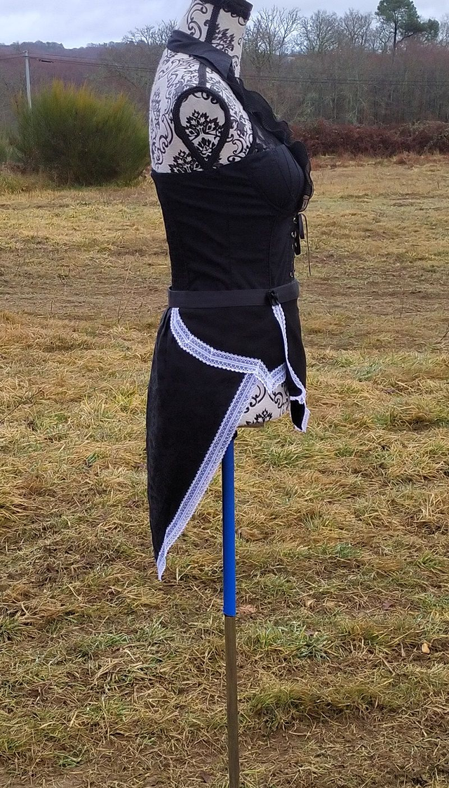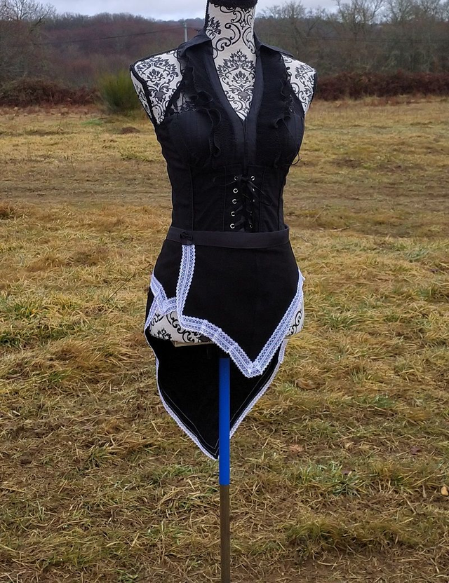 Jolie jupe asymétrique style gothique lolita. La jupe est composée d'une ceinture en satin noir, de deux pièces en polyester aspect suédine noire et d'une grande pièce en satin noire à motifs de fleurs en relief. Les pièces sont décorées de dentelle blanche. La jupe se ferme à l'aide de trois boutons pressions argenté. La jupe est réglable. Le vêtement peut se poster par dessus un legging ou un short.