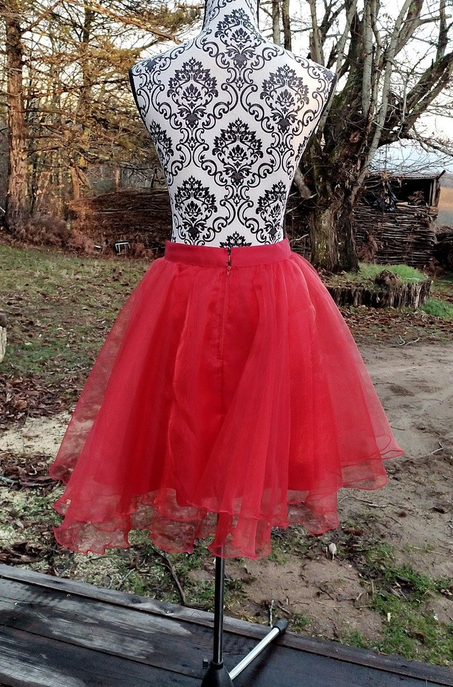 Jolie jupe cercle mi longue en satin et organza. Ceinture en satin. Le vêtement se ferme par le biais de crochets et d'une fermeture à glissière au dos du vêtement. Le vêtement n'est pas réglable.