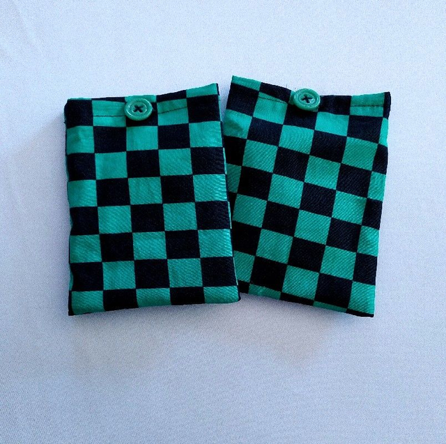 Poche en popeline de coton à damiers verts et noirs, fermeture bouton fantaisie vert. La pochette possède un sac d'absorbant d'humidité composé de petites billes. Plusieurs modèles disponibles: