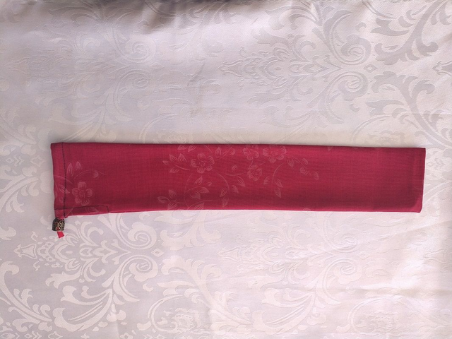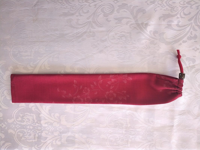 Pochette grand éventail 30 - 35cm max. L'accessoire est en tissu, accompagné d'une cordelette & d'un "stop cordon" en métal fantaisie permettant de fermer la pochette. Modèle simple éventail ou double éventails.