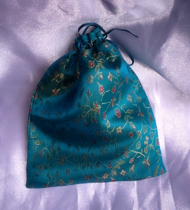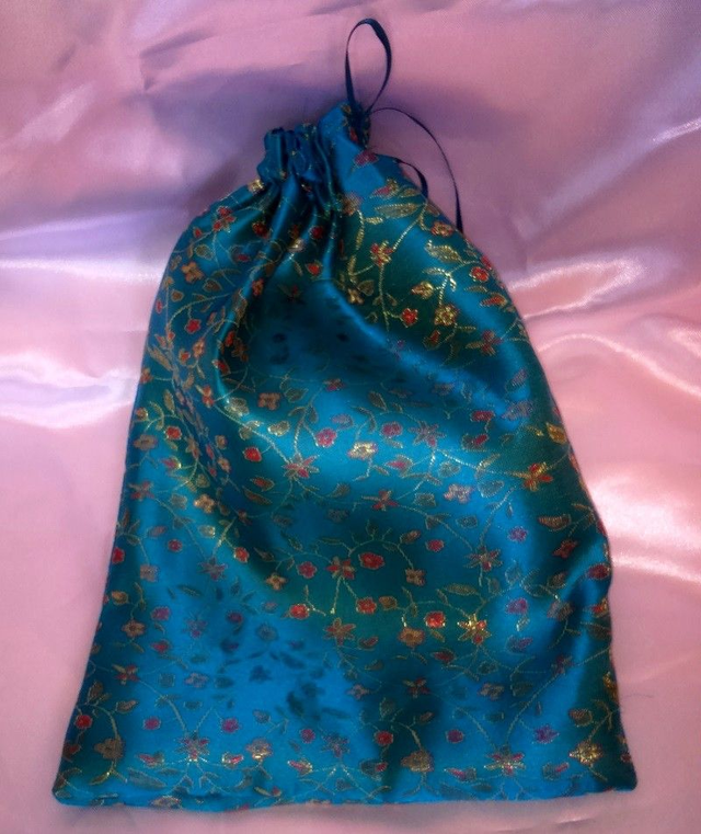 - Satin bleu turquoise à motifs de fleurs dorées vertes et roses, doublure satin uni bleu turquoise, lien ruban fin turquoise. 22 x 30cm environ