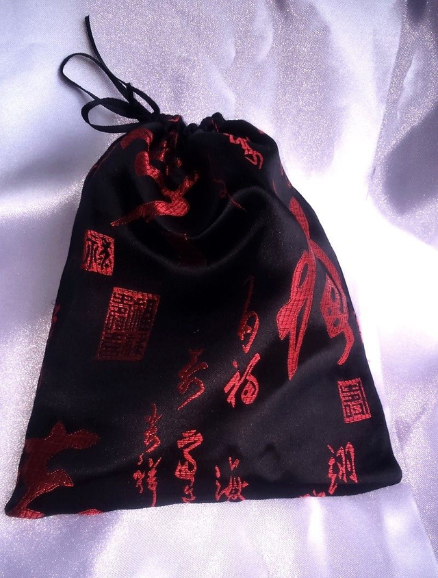 -Idéogrammes: Satin asiatique noir à motifs d'idéogrammes rouges, doublure satin noir uni, lien ruban fin noir. 22 x 17cm