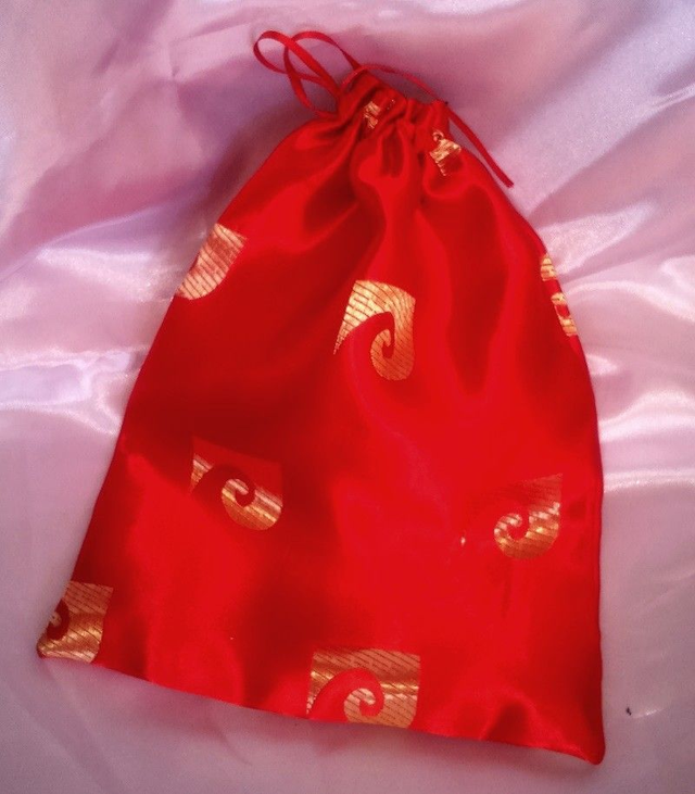 - Satin rouge à motifs de vagues dorées, doublure satin uni rouge, lien ruban fin rouge. 22 x 30cm environ