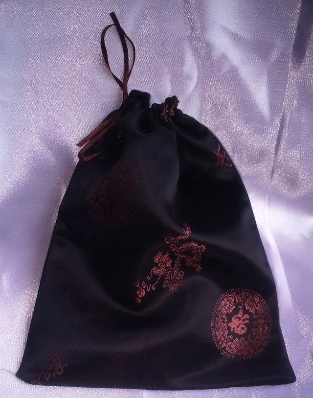 -Dragons: Satin asiatique noir à motifs de dragons et de symboles marrons, doublure satin noir uni, lien ruban fin marron. 22 x 17cm