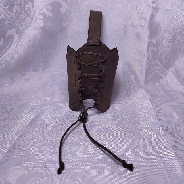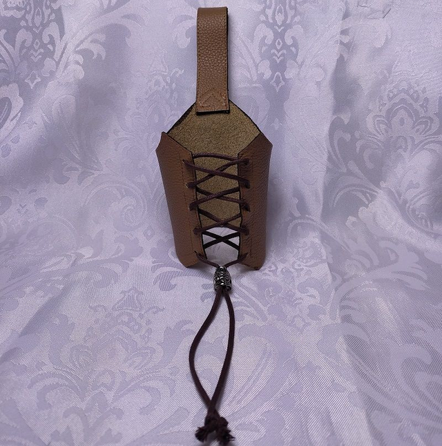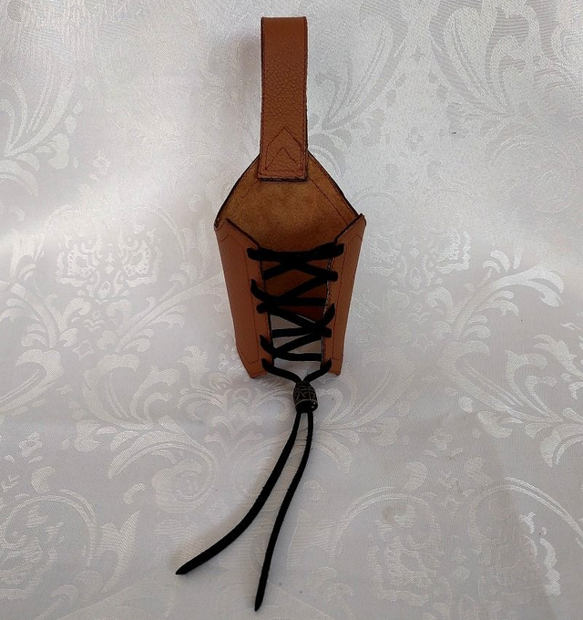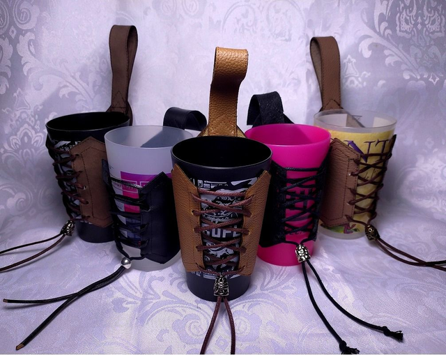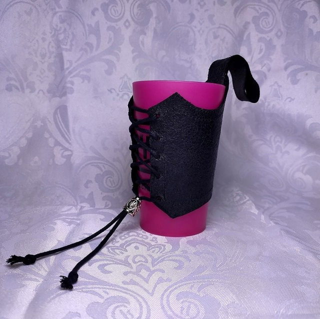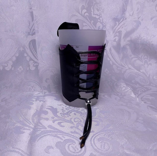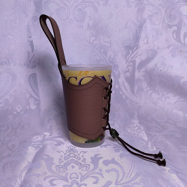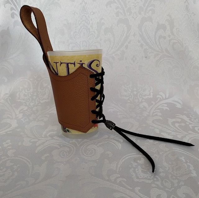 Porte gobelet cuir de forme fantaisie avec anse et laçage sur le devant, décoré d'un stop cordon en métal. Le porte gobelet convient à tout types d'éco-cup format 25cl.