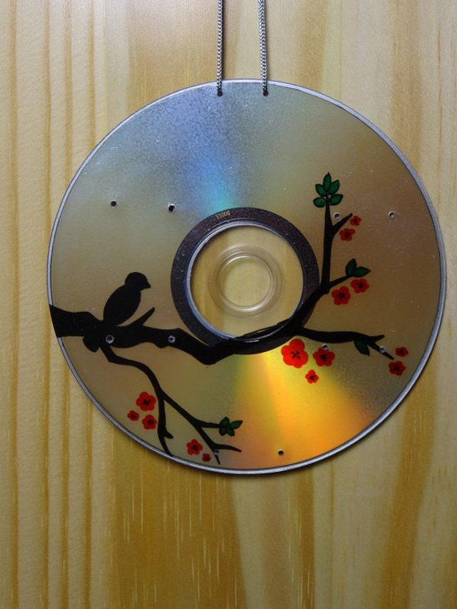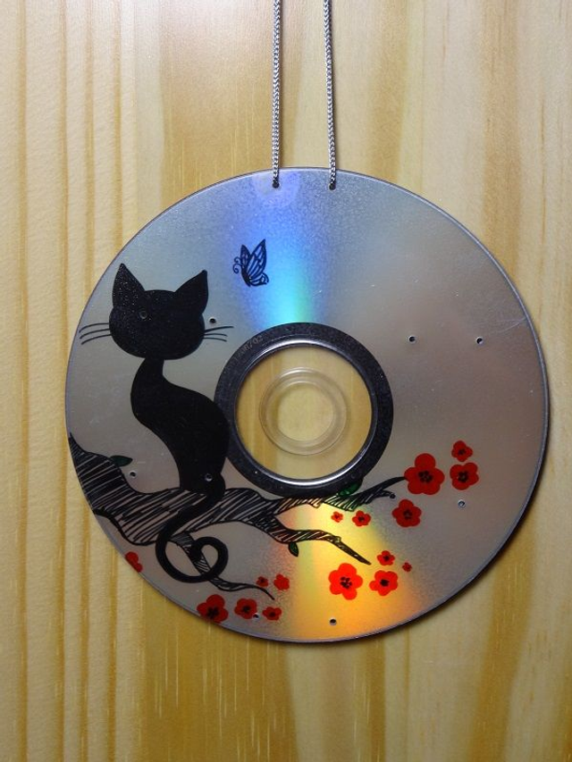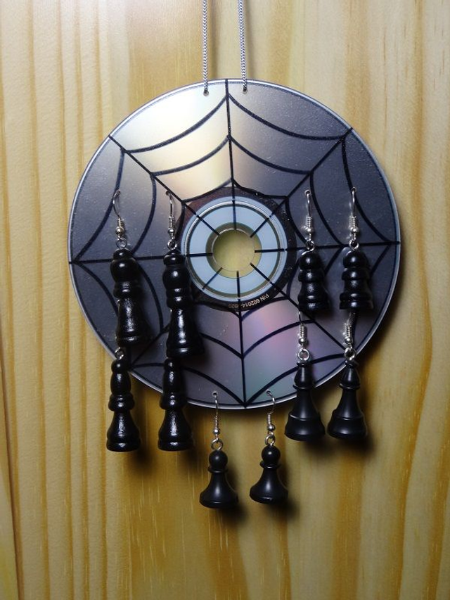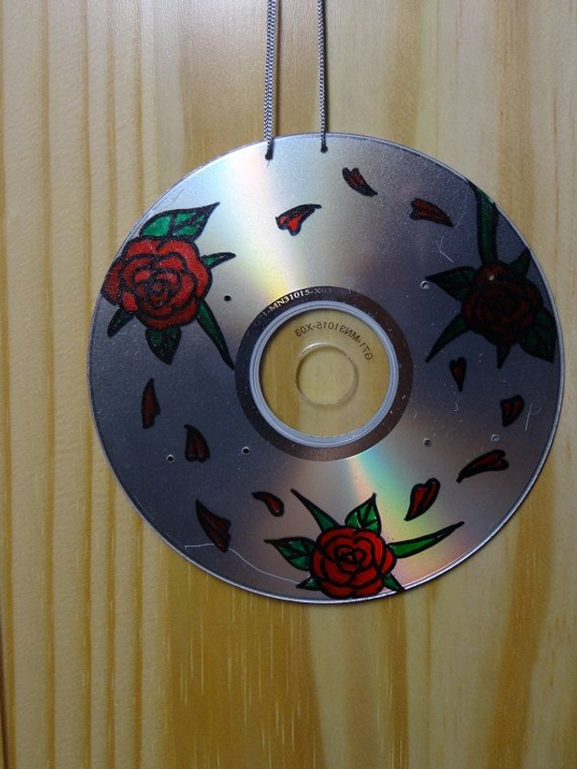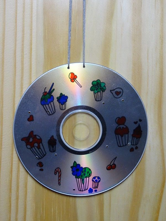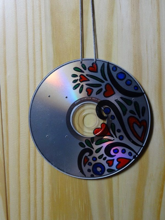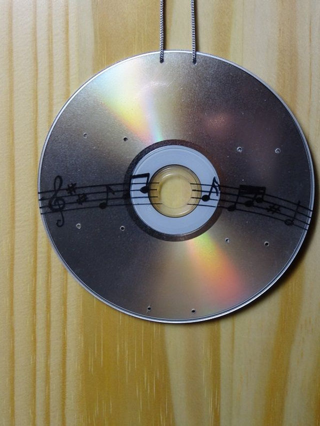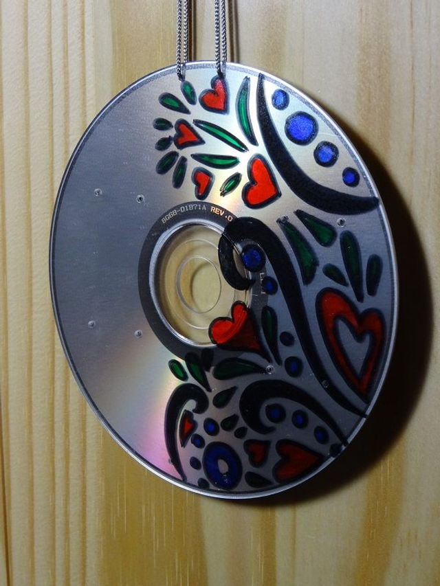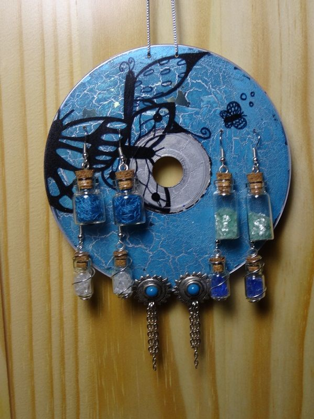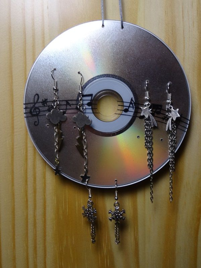 Présentoir (rangement) pour bijoux CD recyclé, composé de 10 trous (10 emplacements pour boucles d’oreilles ou clous). L’envers du disque est de couleur argenté. Le devant du CD est décoré. Un lien est accroché au CD pour le suspendre. Le devant du disque est vernis.