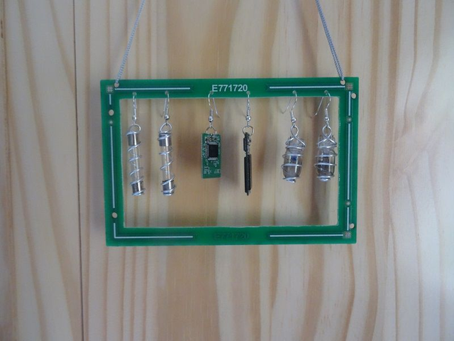 Présentoir pour boucles d'oreilles, cadre circuit imprimé vert et argenté. Le support peut exposer jusqu'à 5 paires au maximum.