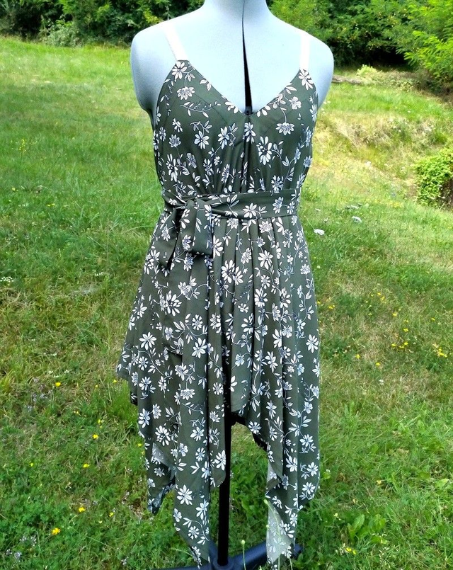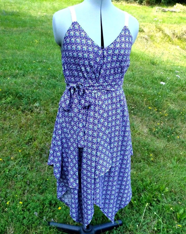 Robe asymétrique en tissu léger à motifs, bretelles réglables, ceinture à nouer. Plusieurs modèles disponibles: