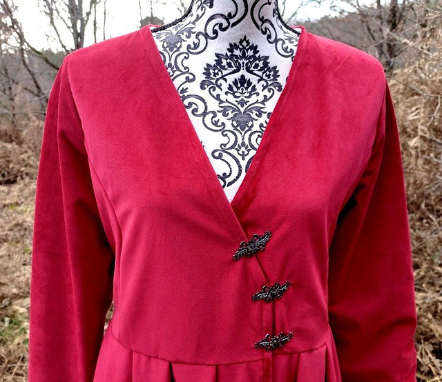 Robe/ veste en velours rouge, doublure polaire blanche. Fermeture brandebourgs en métal argent vieillit. Robe/ manteau en velours rouge et polaire blanche Taille 40/42