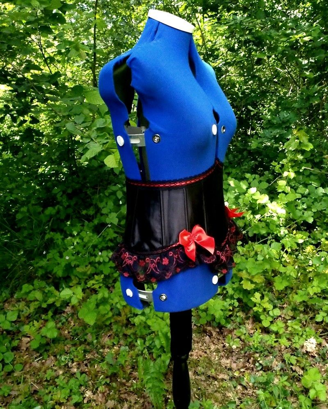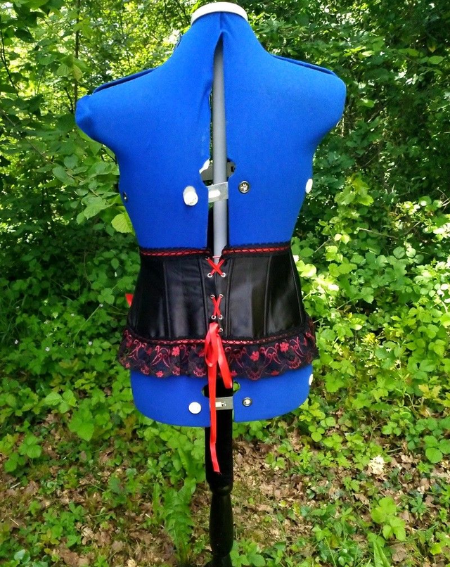 -Gothique rouge et noir: Base satin brillant, décoré de dentelle fine sur le faut et de dentelle large sur le bas avec 2 noeuds en satin rouge. Laçage au dos, fermeture crochets métal sur le coté gauche (2 crans).