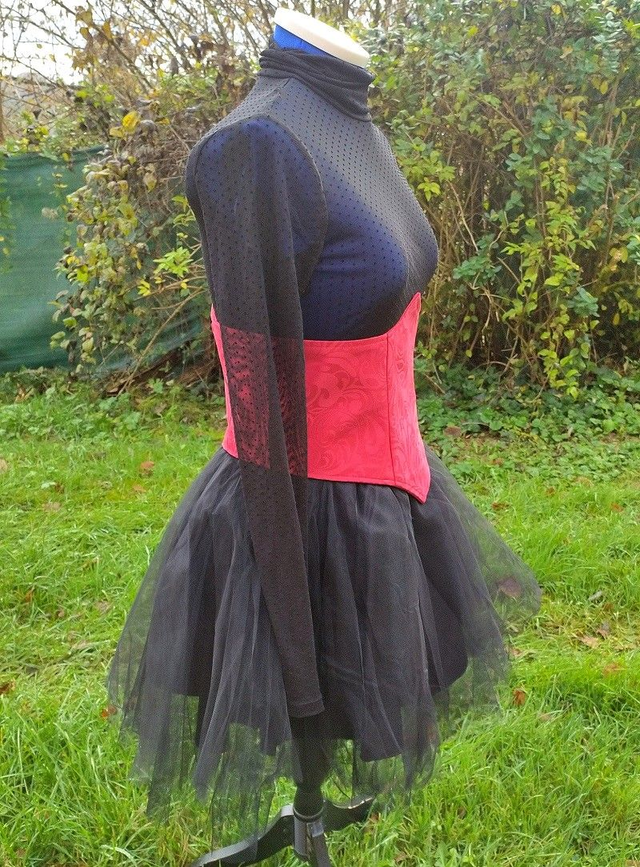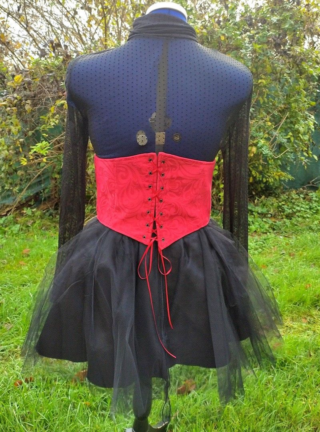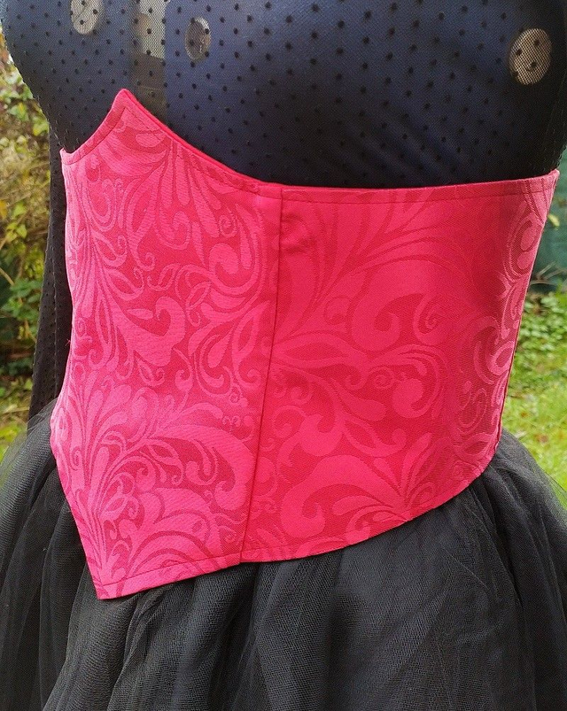 Serre taille en polyester rouge à motifs d'arabesques, laçage au dos, doublure coton "doux".