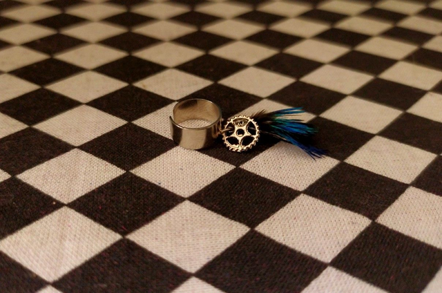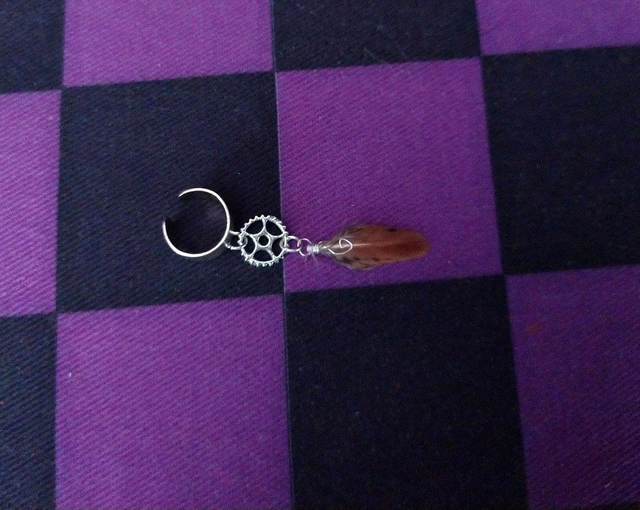 -Plume de paon noire et bleue, accompagnée d'un rouage à trous.