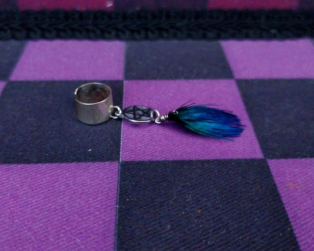 -Plume de paon duvet noir et bleue, accompagnée d'un pentacle. (3pcs disponibles)