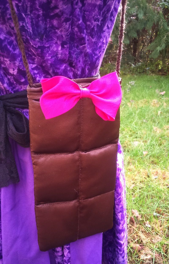 Joli sac à main gourmand, tablette de chocolat en satin marron brillant. Anse fine tressée marron. Les sacs sont fermés par un bouton pression. Deux modèles: