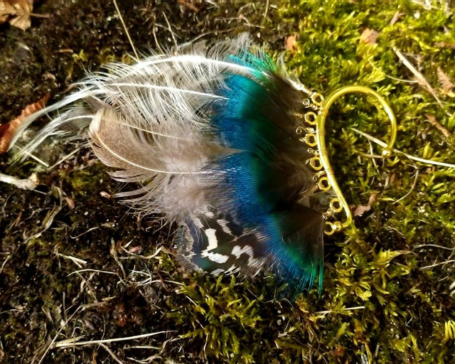 Noir, blanc & bleu: Support argenté et fil aluminium doré, plumes d'oiseau blanches et noires, de plumes de paon bleu/vert noir. Se porte à l'oreille droite. Longueur plumes: entre 6 et 12cm de long