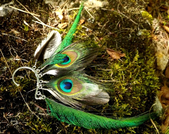 Mix blanc, marron & vert: Support argenté et fil aluminium argenté, plumes d'oiseau blanches et marron, de plumes de paon verte, plume oeil. Se porte à l'oreille gauche. Longueur plumes: entre 7 et 15cm de long